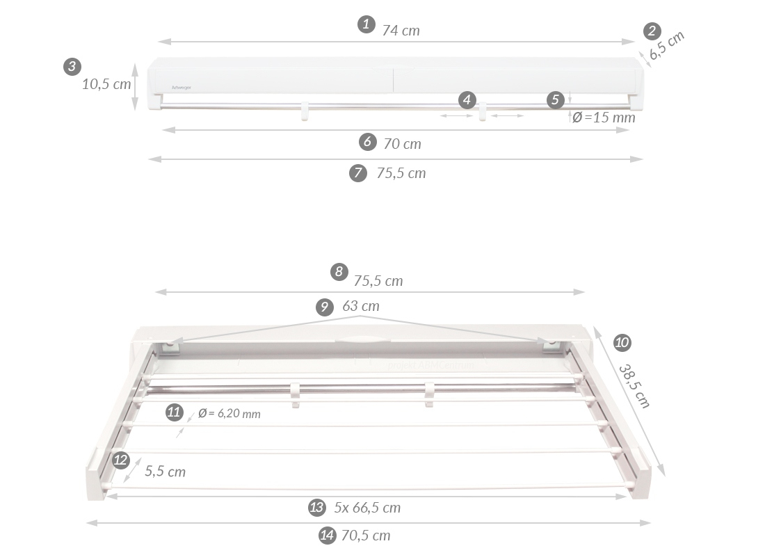 - uscator retractat - 75,5 cm x 6,5 cm x 10,5 cm.