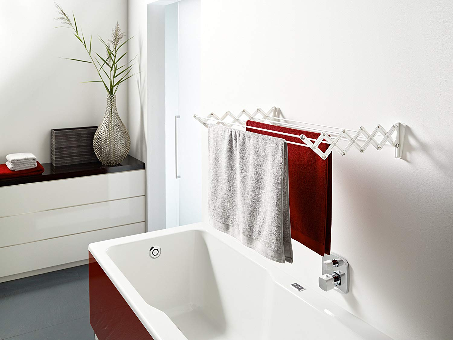 Uscatorul de rufe SMART 80 montat pe perete se caracterizeaza prin capacitatea sa enorma de incarcare. Datorita tijelor sale de otel acoperite cu plastic alb si panourilor laterale din plastic de inalta calitate, uscatorul de rufe este rezistent la intemperii si prin urmare poate fi folosit atat in ​​interior cat si in exterior. Uscatorul de rufe economiseste spatiu in pozitia retractata.