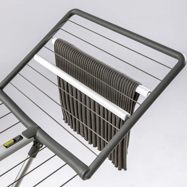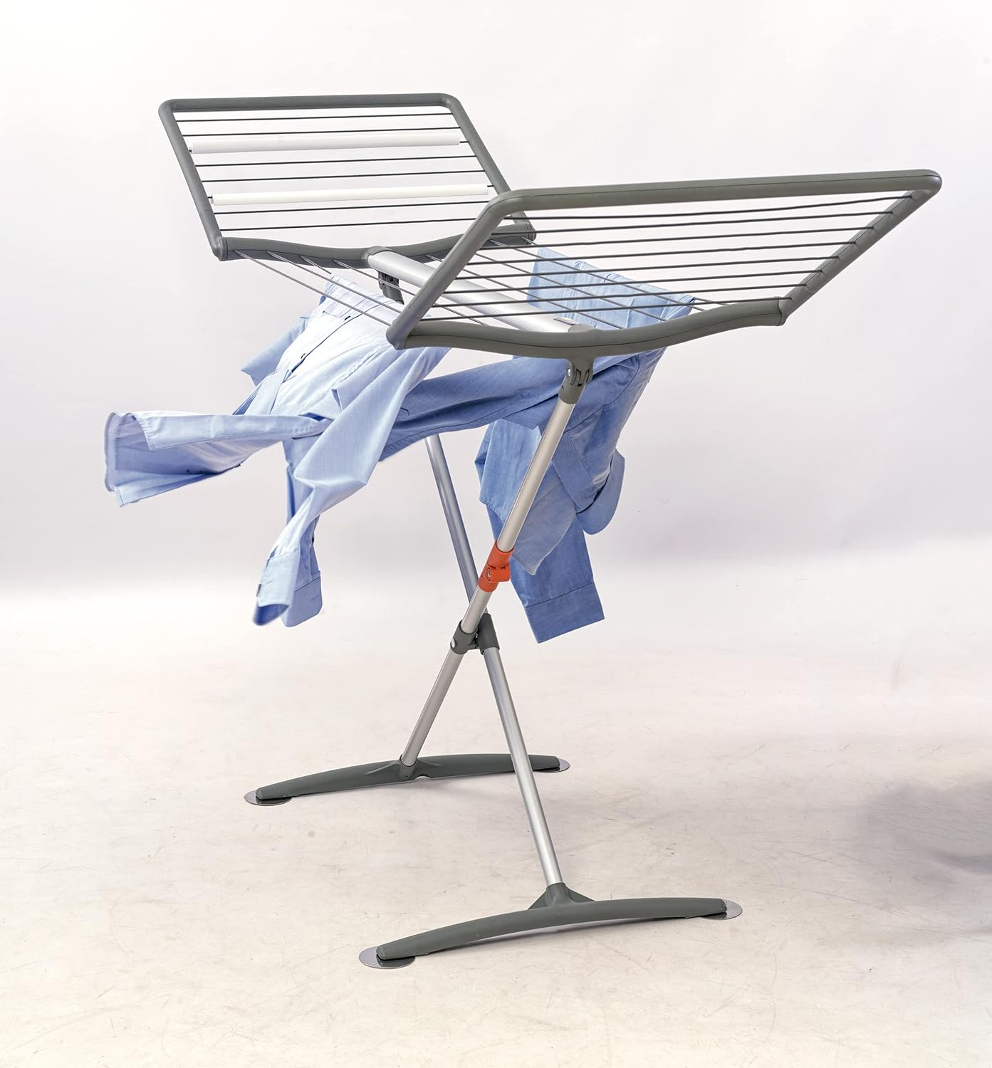Magnetii puternici incorporati in picioare asigura o stabilitate de neclintit pe placutele fixe din otel inoxidabil, chiar si in conditii de vant. Sistemul automat de tensionare a firelor cu ajutorul tehnologiei cu arcuri asigura intotdeauna firele intinse, iar constructia solida din aluminiu suporta fara efort chiar si rufele grele. Practic si confortabil: atunci cand aveti o cantitate mica de rufe, pliați pur si simplu aripile laterale in pozitie verticala, iar cand nu aveti nevoie de ele, puteti depozita uscatorul cu o singura mana, fara efort.